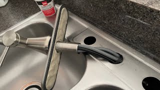 From underneath the sink, locate the three screws on the remaining mounting assembly. Loosen these screws until the lower part of the mount (the backup flange) can be removed. Next, you will see a thin, springy metal snap ring holding the rest of the assembly in place. Carefully pry one end of this snap ring out of its groove using a flathead screwdriver. Be cautious as it can spring off unexpectedly. Once the snap ring is off, the rest of the mounting hardware will come free. Move to the top of the sink. Use a putty knife to gently pry up and remove the old sink flange (the metal drain piece). Scrape away all the old, hardened plumber's putty from the sink's surface. For a perfectly clean surface, wipe the area around the drain hole with a cloth and a small amount of rubbing alcohol.
