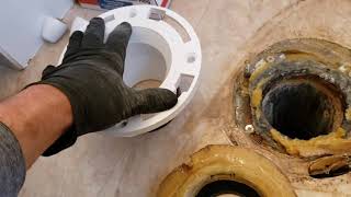 With the toilet removed, you will see the old wax ring on the toilet flange. Use a putty knife to scrape all of the old wax off the flange and the surrounding floor. Be thorough to ensure the new ring will seal properly. It's also a good idea to clean the bottom of the toilet horn where it meets the wax ring. Once the wax is removed, stuff a large rag into the drain pipe. This is a crucial step to prevent unpleasant sewer gases from entering your home and to stop tools or debris from falling down the drain. With the area clean, use a flashlight to carefully inspect the existing flange for the exact location and extent of the damage. Also, check the condition of the subfloor around the flange for any signs of water damage, discoloration, or rot.