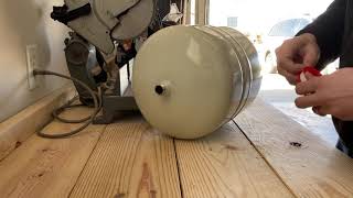 With all connections severed, carefully tilt the old pressure tank to drain any remaining water into your bucket. These tanks are awkward and can be very heavy. If it's a larger tank, use a hand truck or dolly to move it out of the work area. Place rags on the floor to absorb any spills.